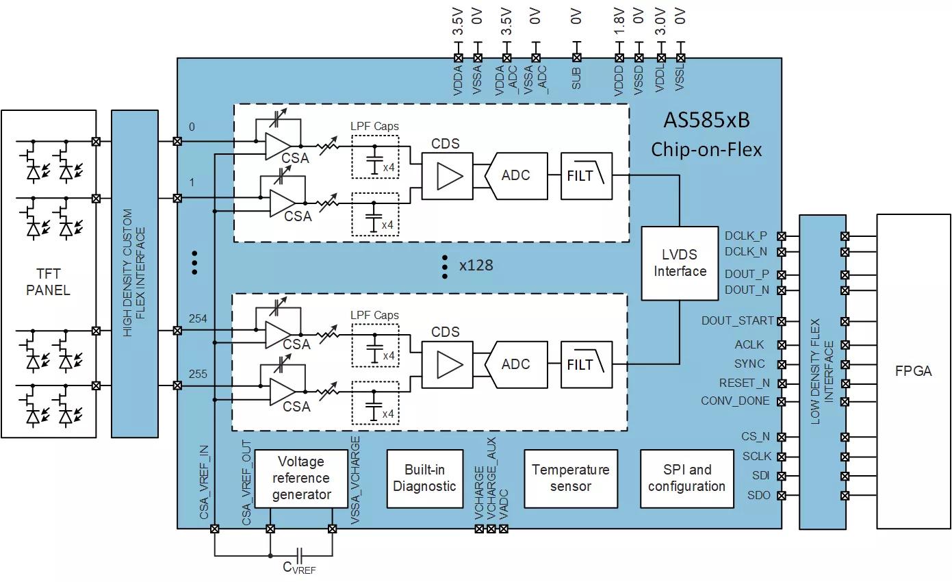 - Chip-on-flex packaging suitable to ACF bonding on the detector side and to a low-cost standard connector on the PCB side